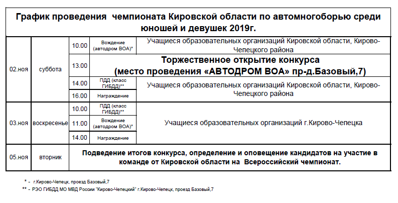 Место проведения чемпионата: экзаменационный класс РЭО ГИБДД МО МВД России «Кирово–Чепецкий», автодром «ВОА» пер. Базовый г. Кирово–Чепецка.